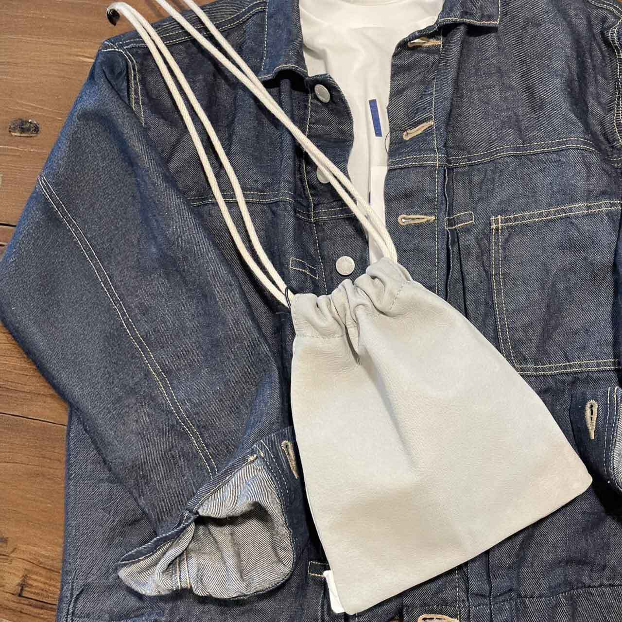 柔らかさを出す為に洗いをかけたピッグスキンの巾着ポシェットです。こちらは通常の巾着ポシェットよりひとまわり大きなミディアムサイズ。財布やスマホ、メガネなどが入ります。(長財布も入りますが、大きさによっては巾着を絞れない場合あり。バッグの中から飛び出ることはありません。)一点一点異なるシワ感と、使い込んだような独特の風合いが魅力です。紐の付け方が輪になっているので物の出し入れがしやすく、斜め掛けで使うことも出来ます。