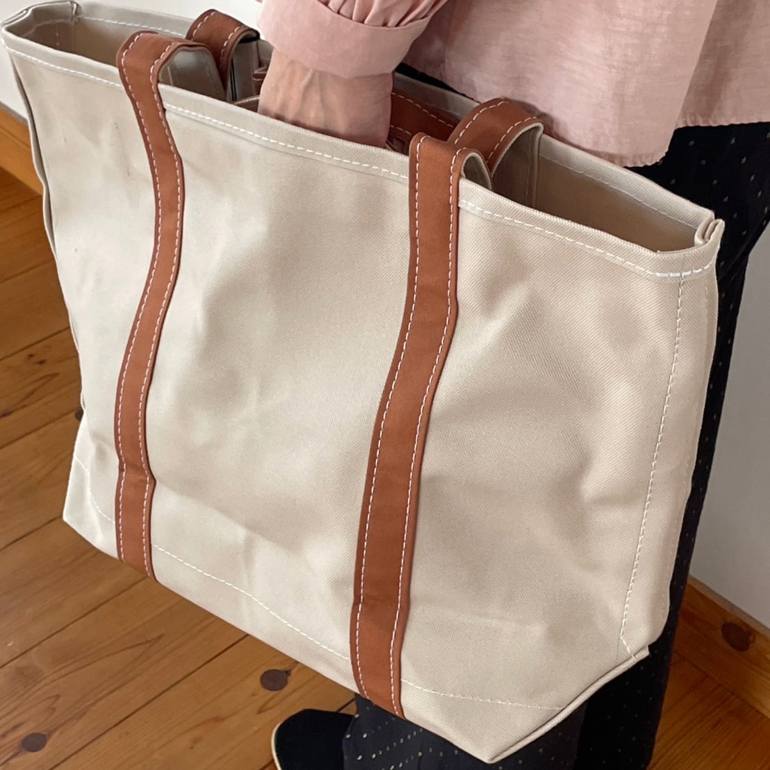 長めの肩ひもがついた大容量&シンプルなデザインのトートバッグ。