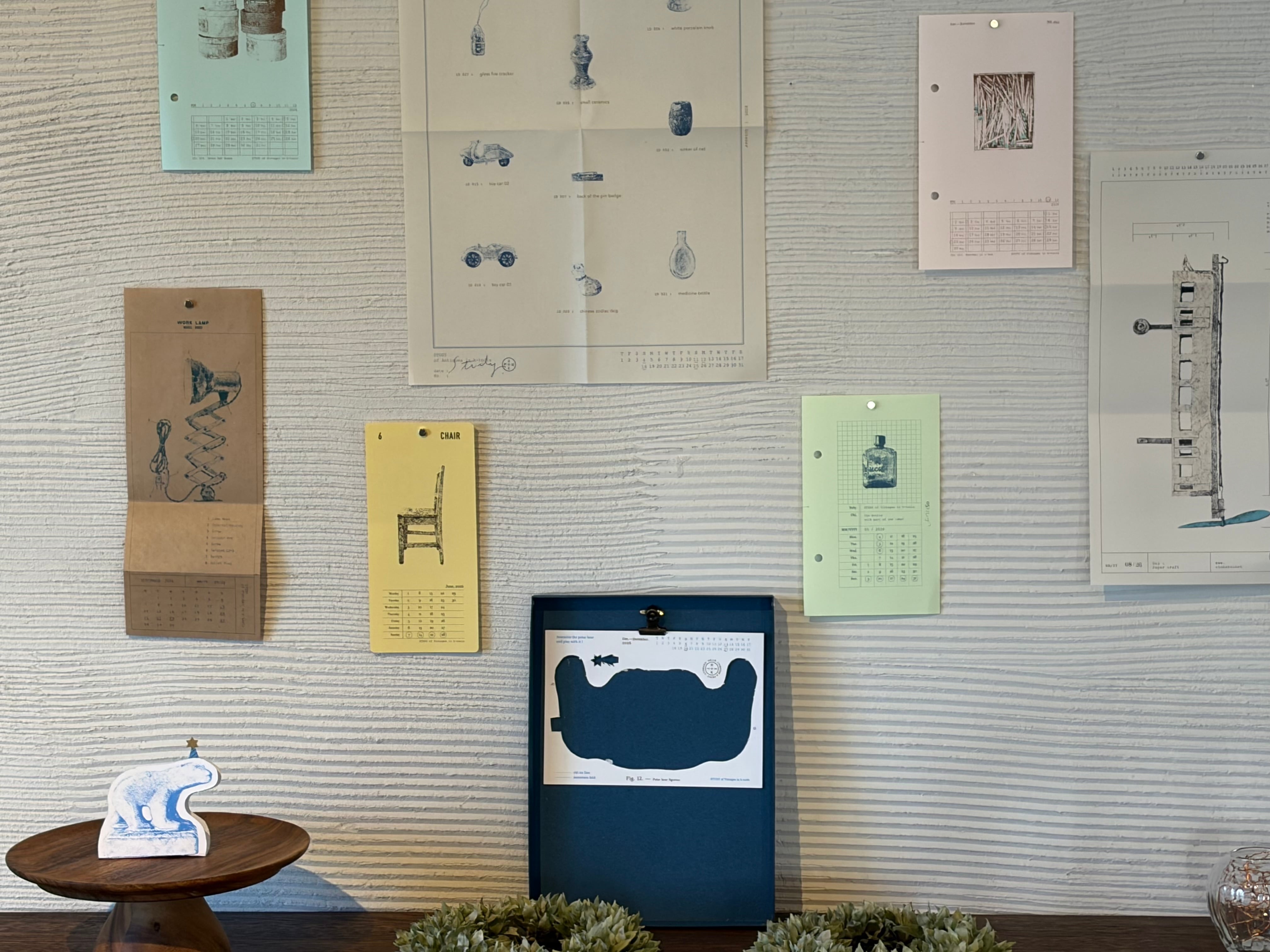 こちらは三重県伊賀市で人気の古道具店、k-toolsさんの味わい深くユーモラスな品々を描いたカレンダーです。STUDYの題の通り古道具と学びがテーマになっていて、計算カードやルーズリーフのようなもの、設計図や博物館のようなデザインなど、大きさも様々な8枚のシートと折本が入っています。箱についているクリップに止めて箱のまま飾ったり、全部広げて壁に飾ったり。。。素敵な見え方・飾り方を探ってみてくださいね。