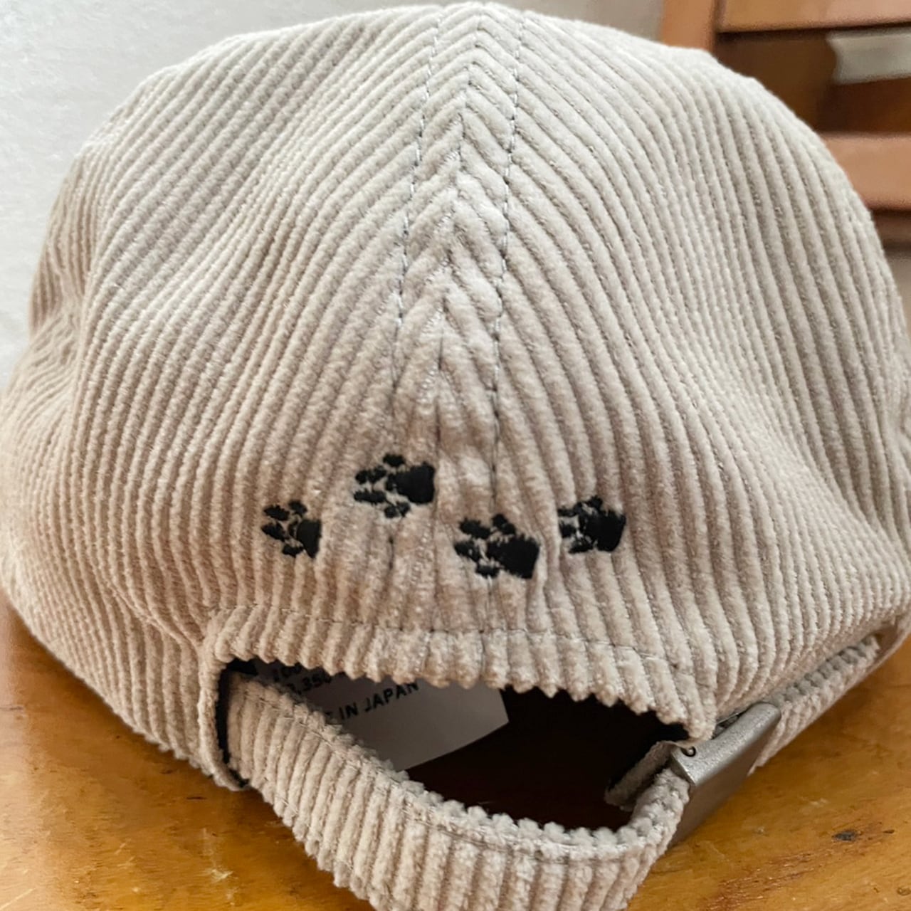 柴犬の刺繍がかわいい、コーデュロイ素材を使ったシバキャップ。後ろ姿も抜かりなく、DOG柄とリンクした“足跡”が刺繍されているのがまたかわいい。犬好きの方へのプレゼントにも喜んでもらえそうです。
